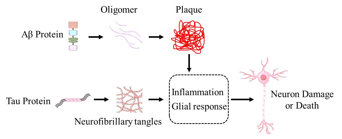 Figure.1 The formation of Aβ plaque and neurofibrillary tangles. This diagram depicts the pathological features of Alzheimer's Disease (AD). Amyloid β-protein (Aβ) first forms oligomers, which then aggregate into plaques. Tau protein forms neurofibrillary tangles. Both amyloid plaques and neurofibrillary tangles trigger an inflammatory glial response. This response ultimately leads to neuron damage or death, highlighting the key pathological processes underlying AD.
