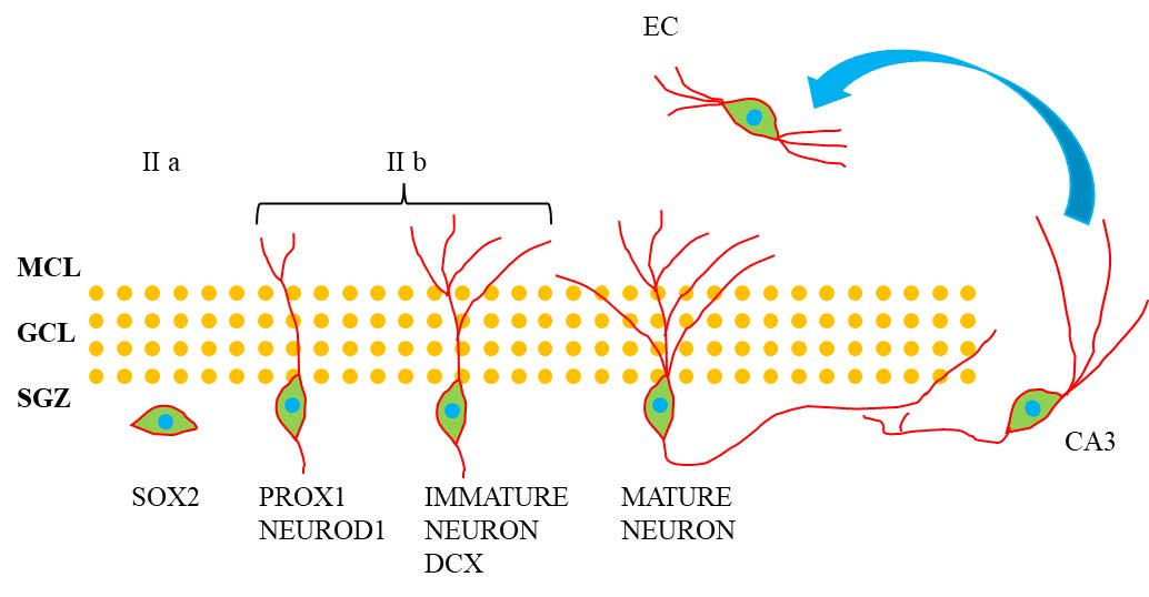 Figure.2 The neurogenesis and neural circuit in the dentate gyrus. This diagram illustrates the process of Adult Hippocampal Neurogenesis. Neural stem cells in the subgranular zone (SGZ) of the hippocampus, marked by the SOX2 marker, give rise to progenitor cells. These progenitor cells, indicated by PROX1 and NEUROD1 markers, differentiate into two subtypes (II a and II b). The II b subtype matures into immature neurons, identifiable by the DCX marker. These immature neurons further develop into mature neurons. The granule cell layer (GCL) and molecular cell layer (MCL) are depicted, with the mature neurons eventually integrating into the dentate gyrus circuitry and projecting to the CA3 region. The entorhinal cortex (EC) is shown with an arrow indicating its connection to the hippocampal neurons, highlighting the neural network integration in the process of adult hippocampal neurogenesis.
