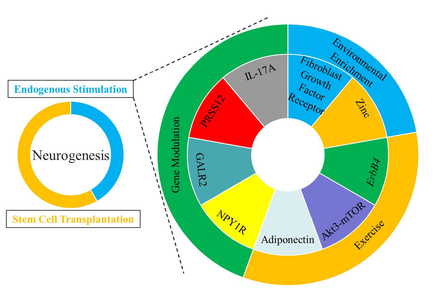 Figure.3 Endogenous stimulation and stem cell translation can improve neurogenesis. This circular char tillustrates various factors influencing neurogenesis. The factors are categorized and presented in different colored segments around the circle. Key elements include endogenous stimulation and stem cell transplantation, which are central to the process of neurogenesis. Surrounding these are multiple factors such as genes, environmental factors and exercise. These elements collectively impact neurogenesis, highlighting the complex interplay of biological and environmental components in this process.