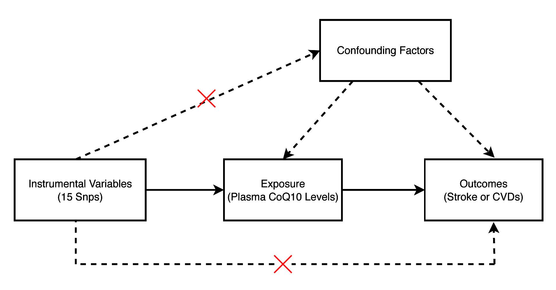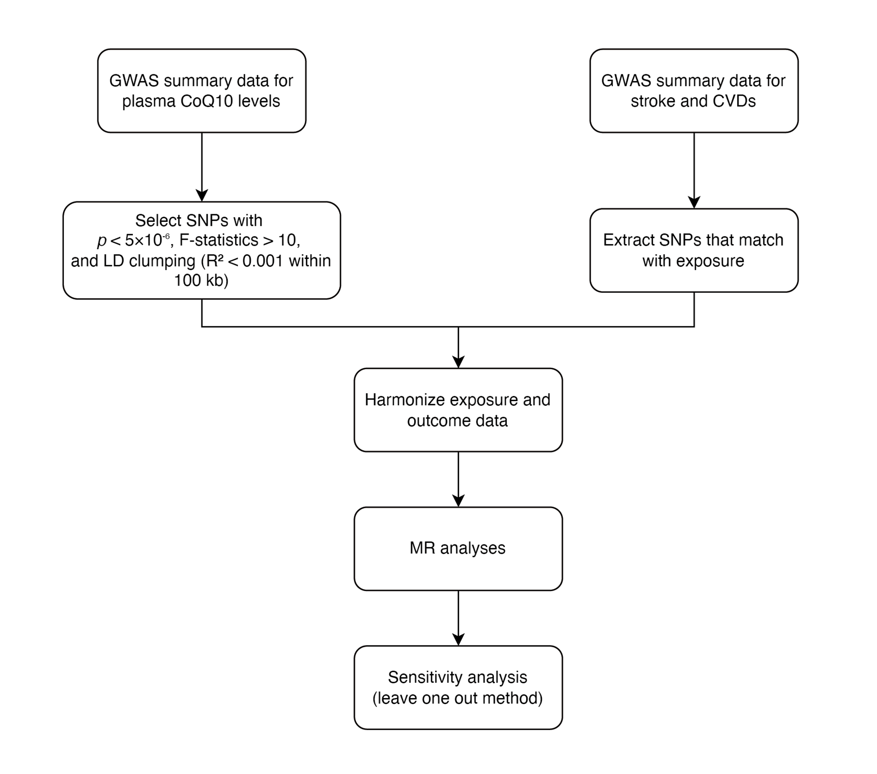 Mendelian randomization analysis stands as a genetic epidemiological method for inferring causality. It utilizes genetic variants derived from summary-level genome-wide association study (GWAS) data as instrumental variables (IVs), effectively minimizing sampling errors and confounding factors [16] . The objective of this MR study is to assess the causal relationships between genetically predicted plasma CoQ10 levels and the susceptibility to stroke and main cardiovascular diseases.
