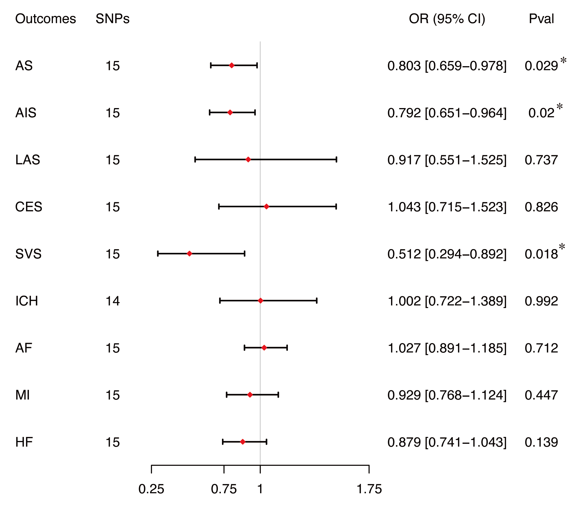 Figure 3 Two-sample mendelian randomization analysis between plasma CoQ10 levels and stroke or cardiovascular diseases by IVW method. AF: atrial fibrillation; AS: any stroke; CES: cardio-embolic stroke; CI: confidence interval; HF: heart failure; ICH: intracranial hemorrhage; IS: ischemic stroke; IVW: inverse variance weighted; LAS: large artery atherosclerosis stroke; MI: myocardial infarction; OR: odds ratio; SNP: single nucleotide polymorphism; SVS: small vessel occlusion stroke;