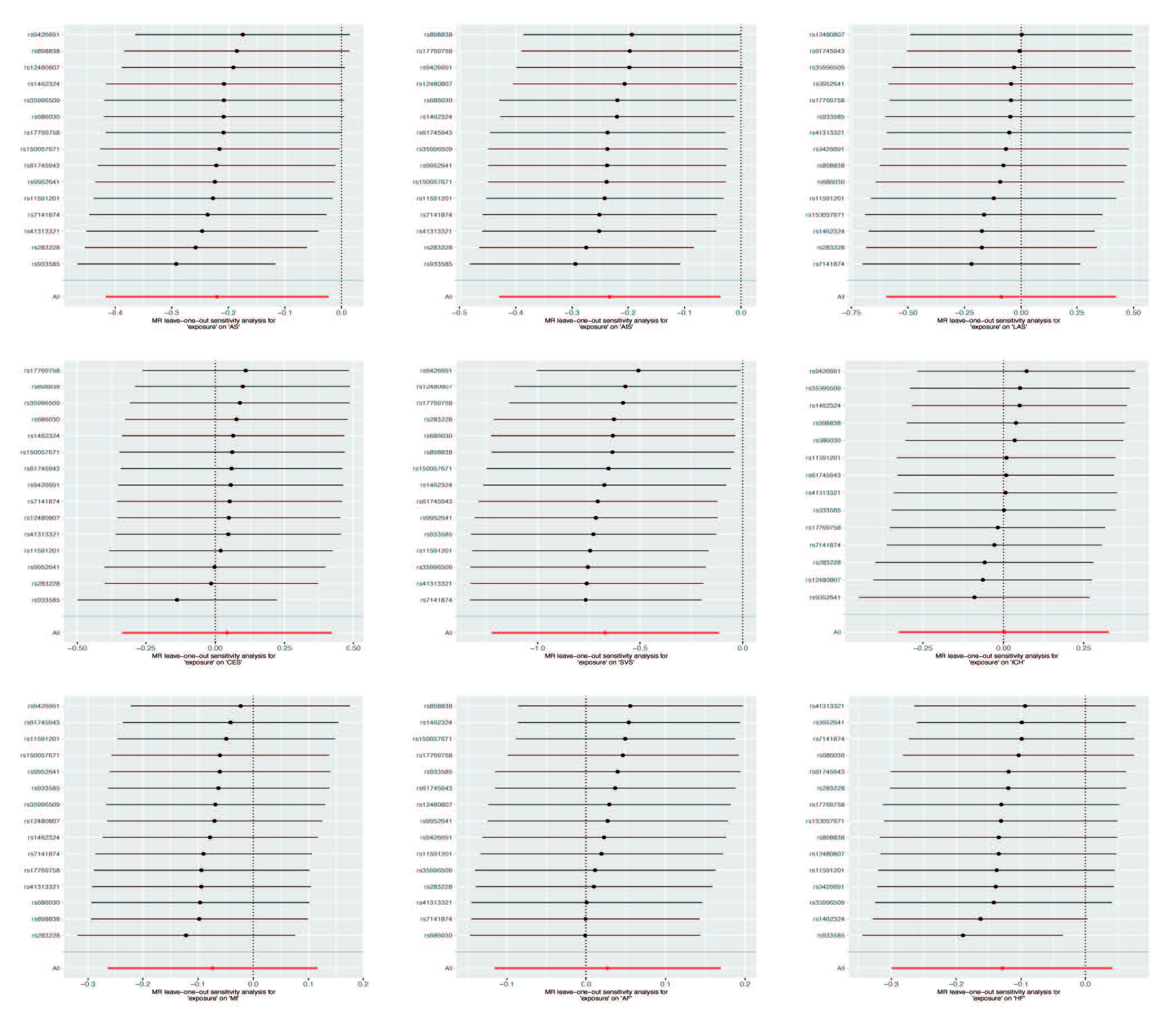 Figure 4 Sensitivity analysis of the association between genetically predicted plsma CoQ10 levels and risk of (A) AS, (B) AIS, (C) SVS, (D) LAS, (E) CES, (F) MI, (G) HF, (H) ICH, (I) AF by leave-one-out method.