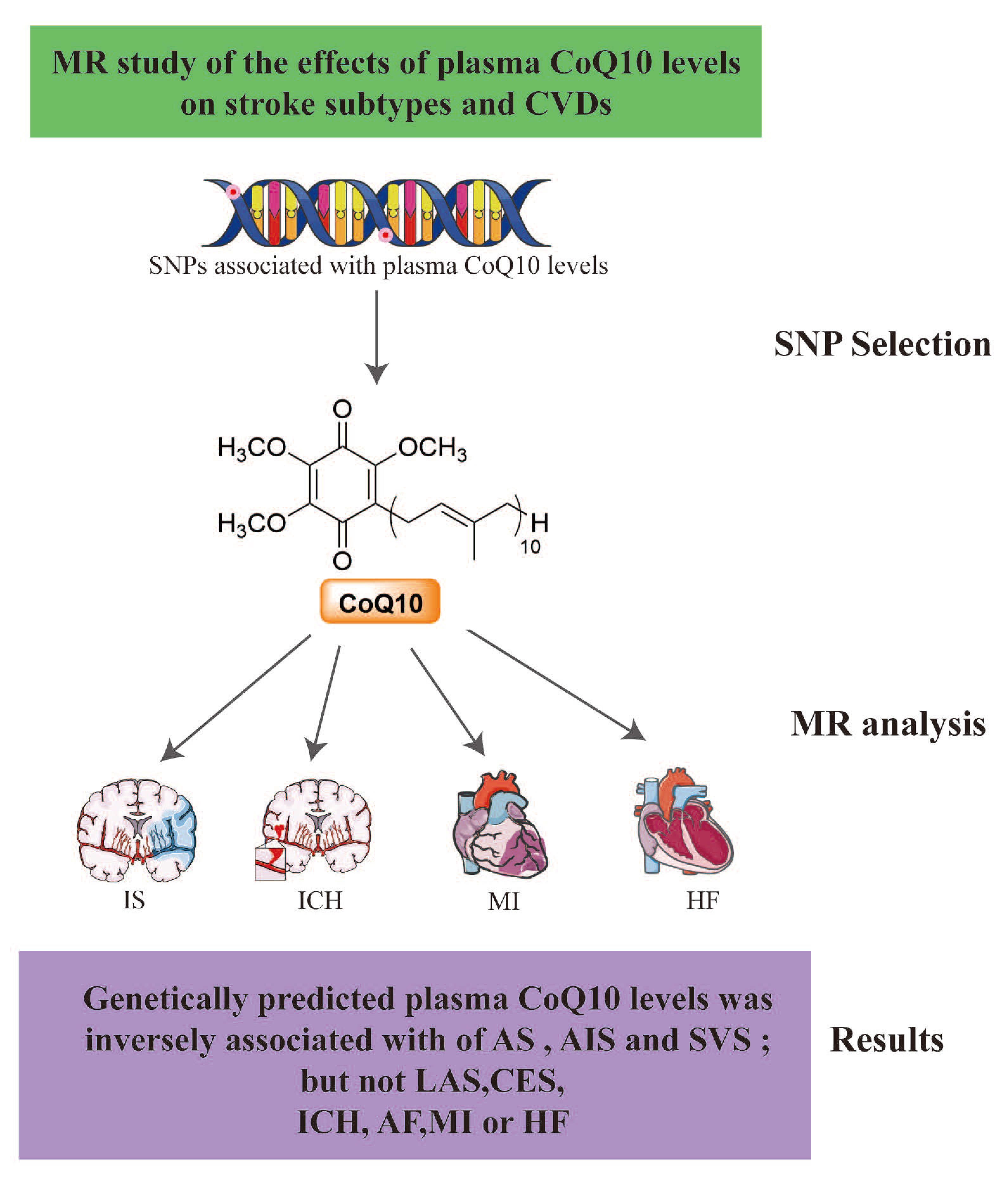 In this study, we utilized genetic variations associated with plasma CoQ10 levels as instrumental variables and employed MR to systematically analyze the causal relationship between plasma CoQ10 levels and stroke, as well as other CVDs. Our results show that (1) genetically predicted plasma CoQ10 levels were inversely associated with risk of AS and AIS; (2) regarding the etiology of ischemic stroke, genetically predicted plasma CoQ10 levels were associated with a lower risk of SAS, but not CES or LAS; (3) no causal links were identified between genetically predicted plasma CoQ10 levels and the risk of ICH, AF, MI and HF.